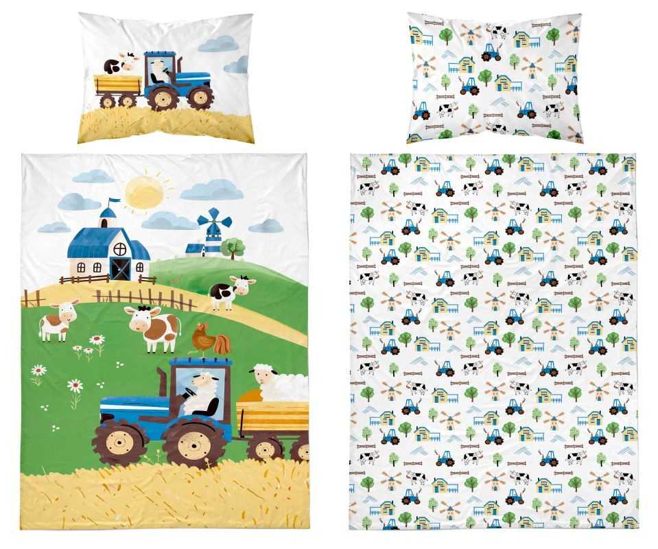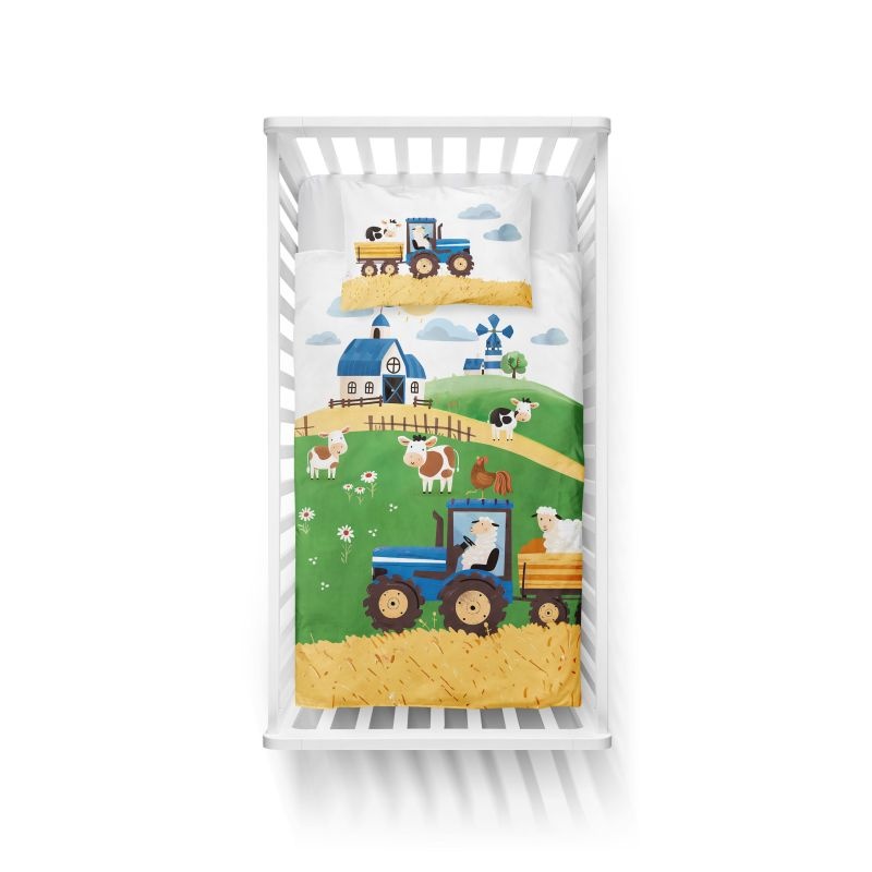 Rozměr 100x135 cm, polštář 40x60 cm. Bavlněné povlečení pro miminka do postýlky, zapínání zip, motiv povleceni do postylky Farma na kopci modrá