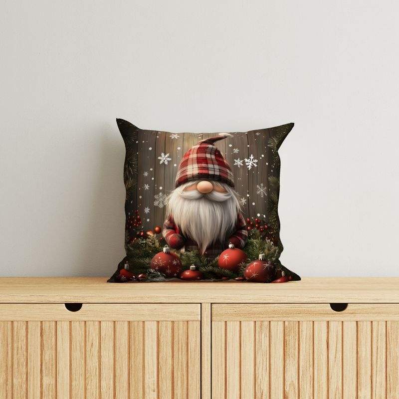 Vánoční dekorativní povlak na polštář s motivem roztomilého trpaslíka a vánočních ozdob — model Trpaslík – ozdoby Micro vnést do vašeho domova sváteční atmosféru a teplo rodinného krbu. Skvěle oživí obývací pokoj, ložnici či dětský pokoj a dodá interiéru originální vánoční styl.