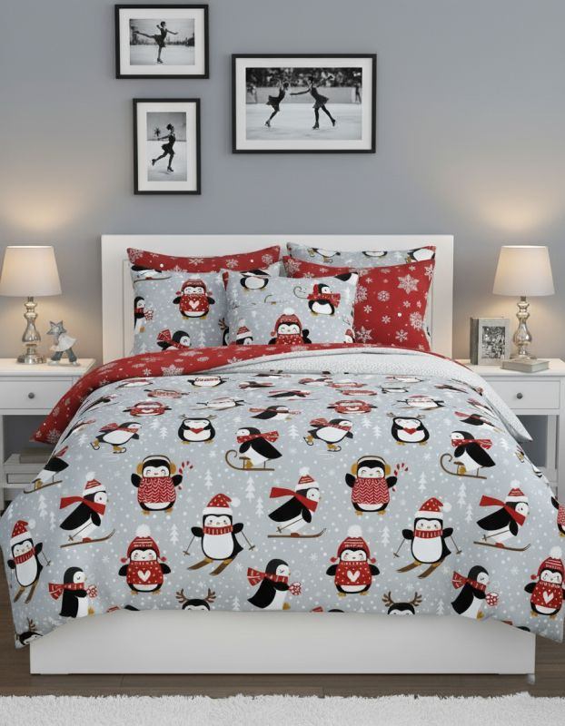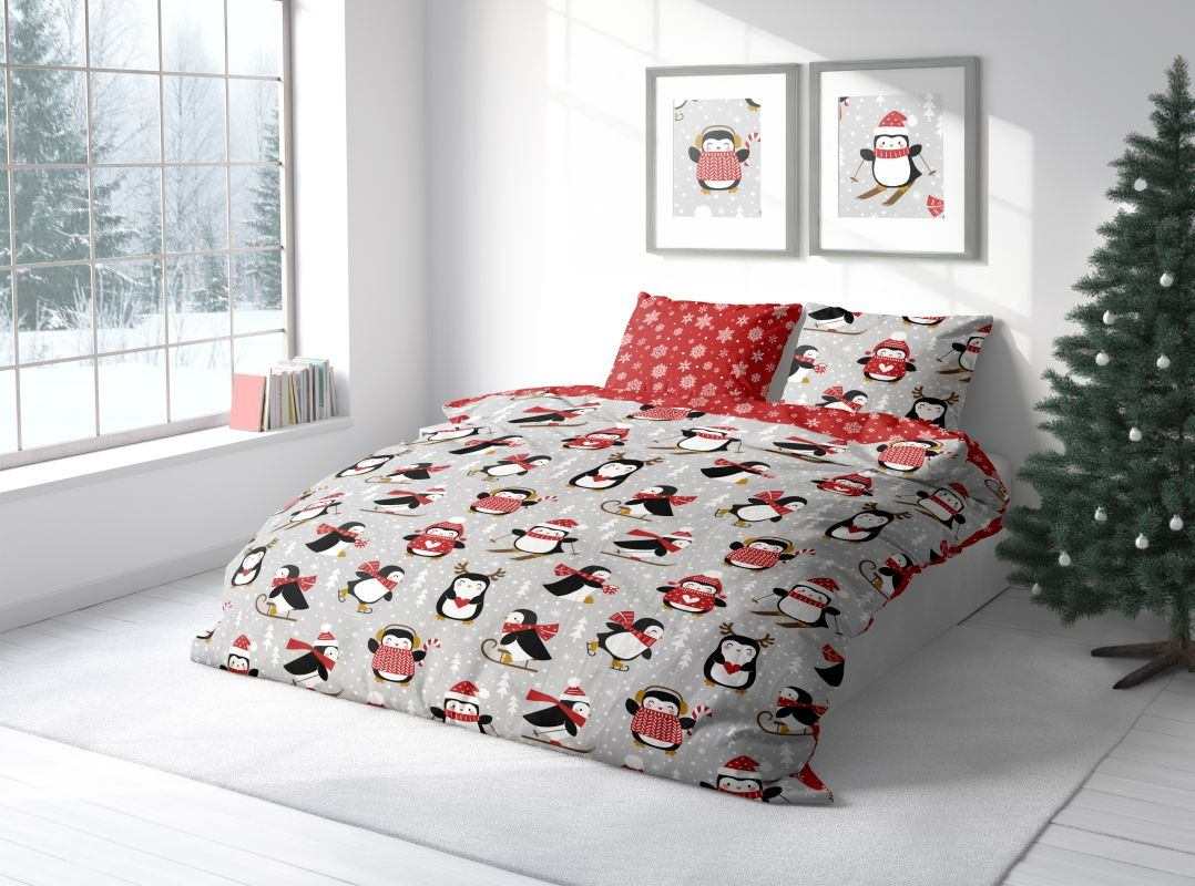 Elegantní a stylové vánoční povlečení Scandic 076 Tučňáci – francouzská velikost přináší do ložnice zimní atmosféru a radost z Vánoc. Díky veselému motivu tučňáků, který evokuje chladné zimní období a sváteční náladu, je to skvělá volba pro každou rodinnou postel. Povlečení je vyrobeno ze 100 % bavlny — měkké, prodyšné a příjemné na dotek — a nabízí pohodlný spánek i dekorativní vzhled. Zapínání na zip zajistí snadné převlékání.